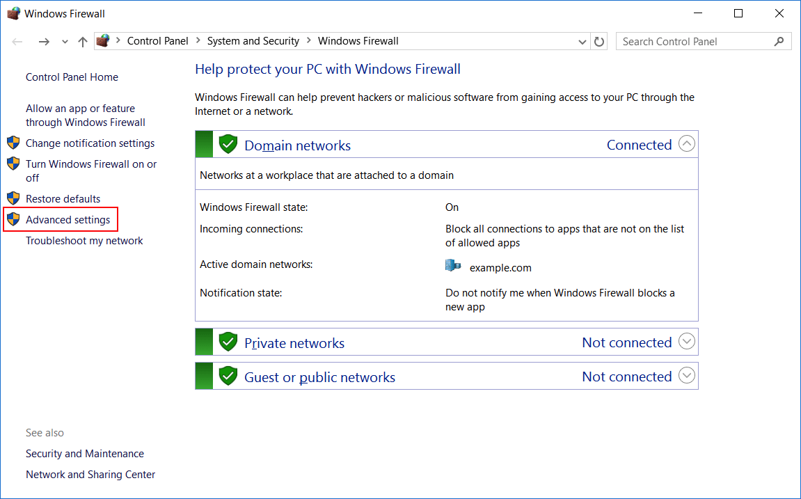 In Control Panel, System Security and select Windows Firewall.